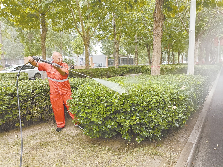 环卫人员利用洒水车高压水枪,对绿化带进行细致冲洗。耿静摄